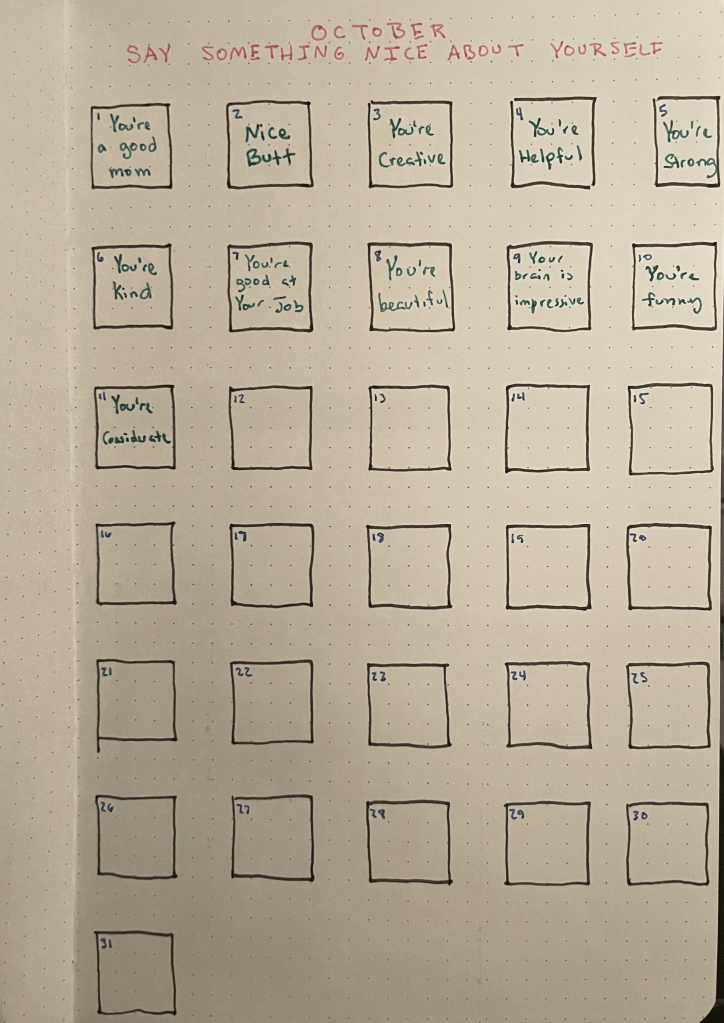 - A page titled “Say Something Nice About Yourself” where I write something nice about myself each day during October